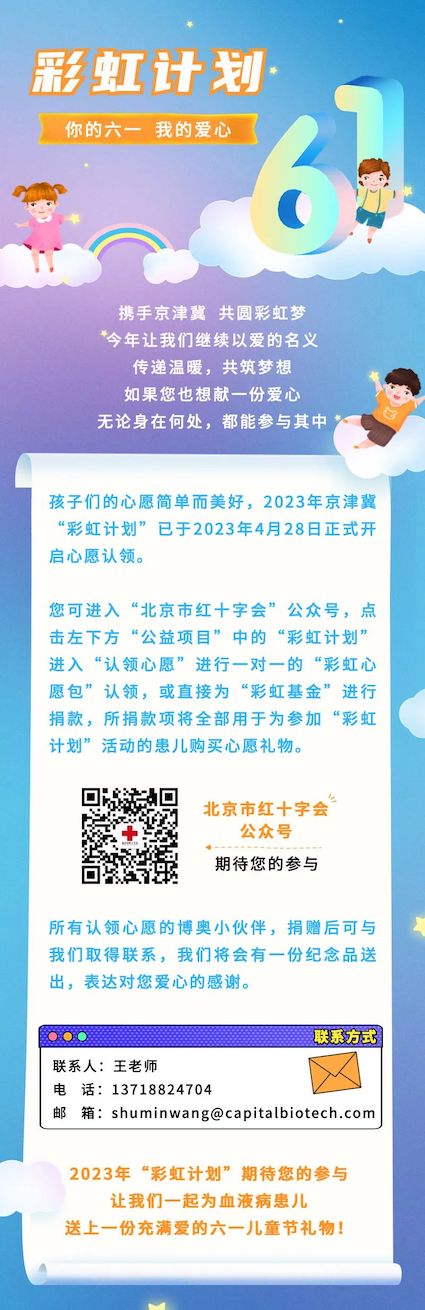 為了更好地關心、關愛血液病患兒,使更多人了解和加入造血干細胞捐獻公益事業(yè),2009年中華骨髓庫和新京報聯(lián)合發(fā)起了“你的六一,我的愛心”公益活動,呼吁全社會關注血液病兒童,為他們送上小小的兒童節(jié)禮物,讓他們感受到來自陌生人的溫暖。此后的每一年,北京市紅十字會和志愿者把這個公益項目延續(xù)至今。2016年起,京津冀三地紅十字會、志愿者和愛心人士一起以“攜手京津冀、共圓彩虹夢”為主題,將這個項目發(fā)展、壯大。